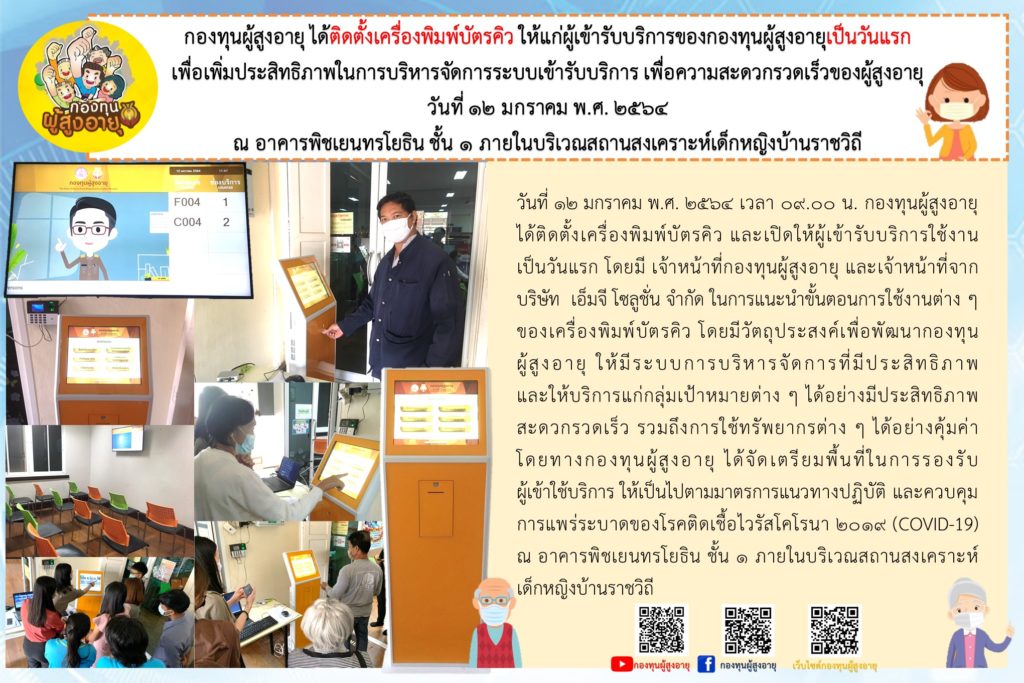 กองทุนผู้สูงอายุ ได้ติดตั้งเครื่องพิมพ์บัตรคิว ให้แก่ผู้เข้ารับบริการของกองทุนผู้สูงอายุเป็นวันแรก เพื่อเพิ่มประสิทธิภาพในการบริหารจัดการระบบเข้ารับบริการ เพื่อความสะดวกรวดเร็วของผู้สูงอายุ