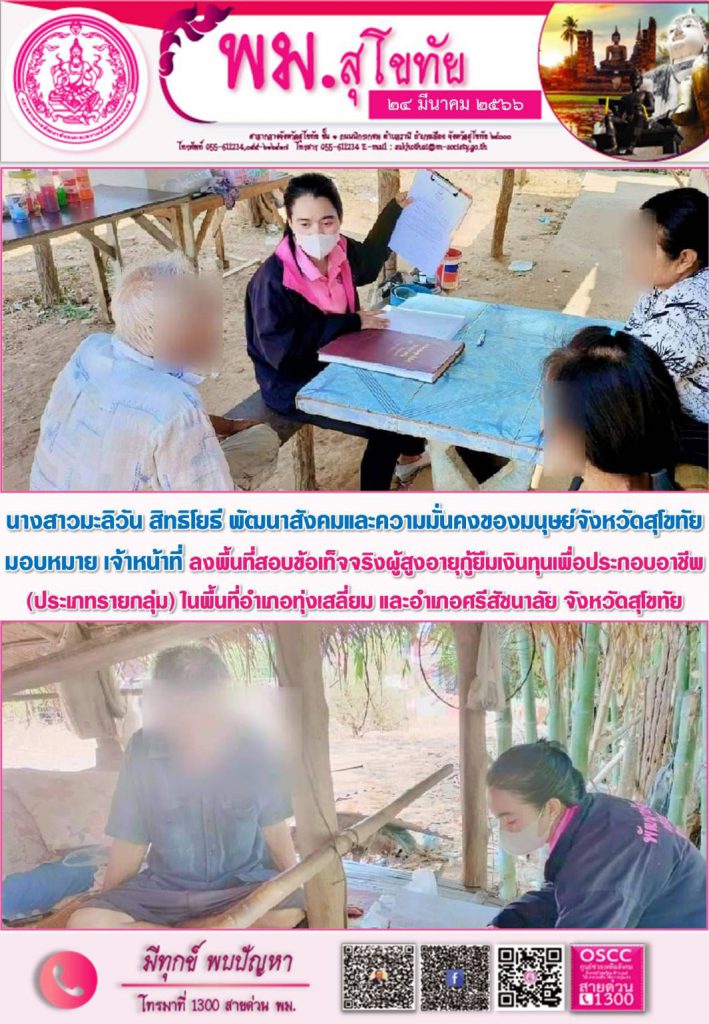 พม.สุโขทัย ลงพื้นที่เยี่ยมบ้าน สอบข้อเท็จจริง ผู้สูงอายุ ที่ขอกู้ยืมเงินทุนประกอบอาชีพจากกองทุนผู้สูงอายุ กรมกิจการผู้สูงอายุ