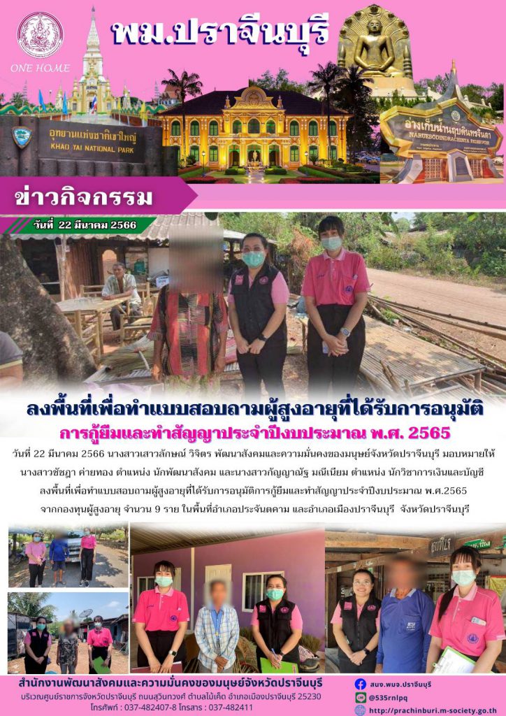 พม.ปราจีนบุรี ลงพื้นที่ทำแบบสอบถามผู้สูงอายุ ที่ขอกู้ยืมเงินทุนประกอบอาชีพจากกองทุนผู้สูงอายุ กรมกิจการผู้สูงอายุ ประจำปีงบประมาณ 2565