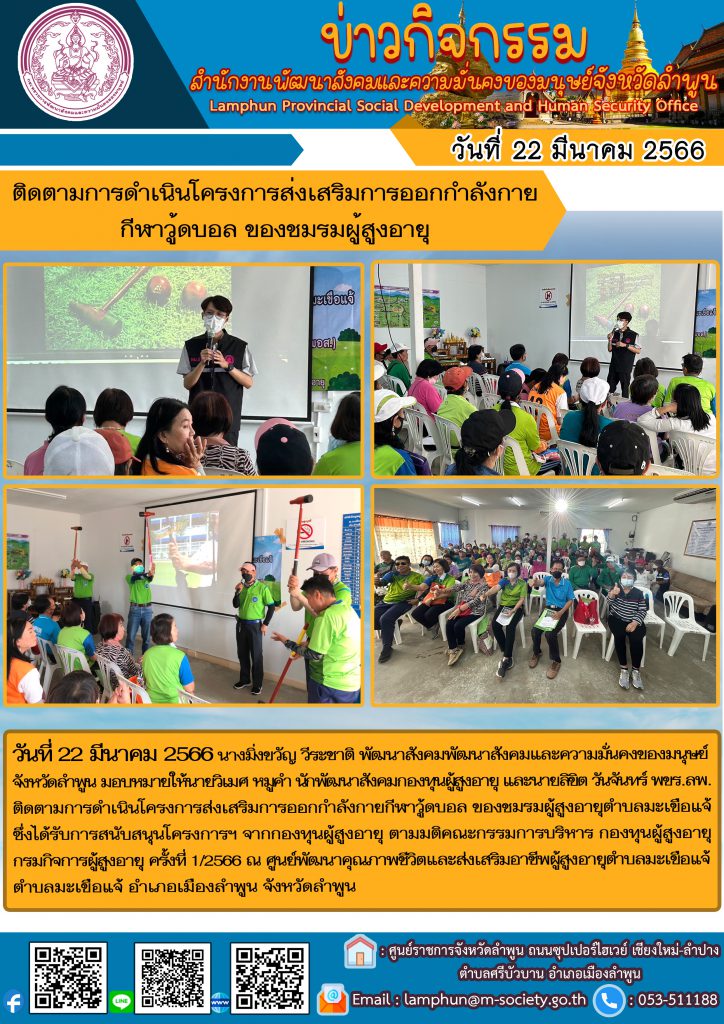 พม.ลำพูน ลงพื้นติดตามการดำเนินโครงการส่งเสริมการออกกำลังกายกีฬาวู้ดบอลที่ได้รับเงินอุดหนุนจากกองทุนผู้สูงอายุ กรมกิจการผู้สูงอายุ