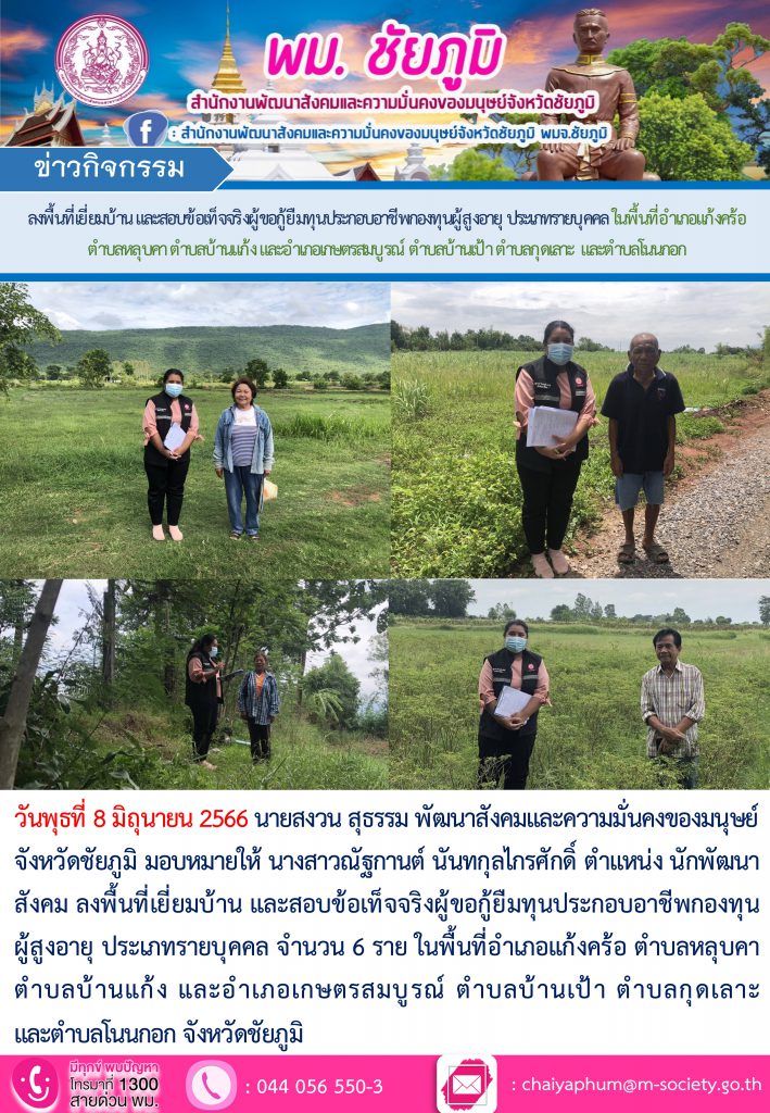 พม.ชับภูมิ ลงพื้นที่เยี่ยมบ้าน สอบข้อเท็จจริง ผู้สูงอายุ ที่ขอกู้ยืมเงินทุนประกอบอาชีพจากกองทุนผู้สูงอายุ กรมกิจการผู้สูงอายุ จำนวน 12 ราย