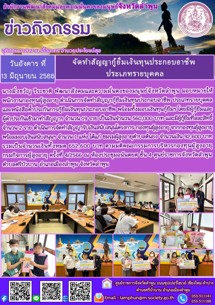 พม.ลำพูน นัดหมายผู้กู้ยืมและผู้ค้ำประกันทำสัญญากู้ยืมเงินทุนประกอบอาชีพที่ได้รับการอนุมัติ รอบที่ 4/2566 จำนวน 19 ราย และสนับสนุนโครงการ 1 โครงการ