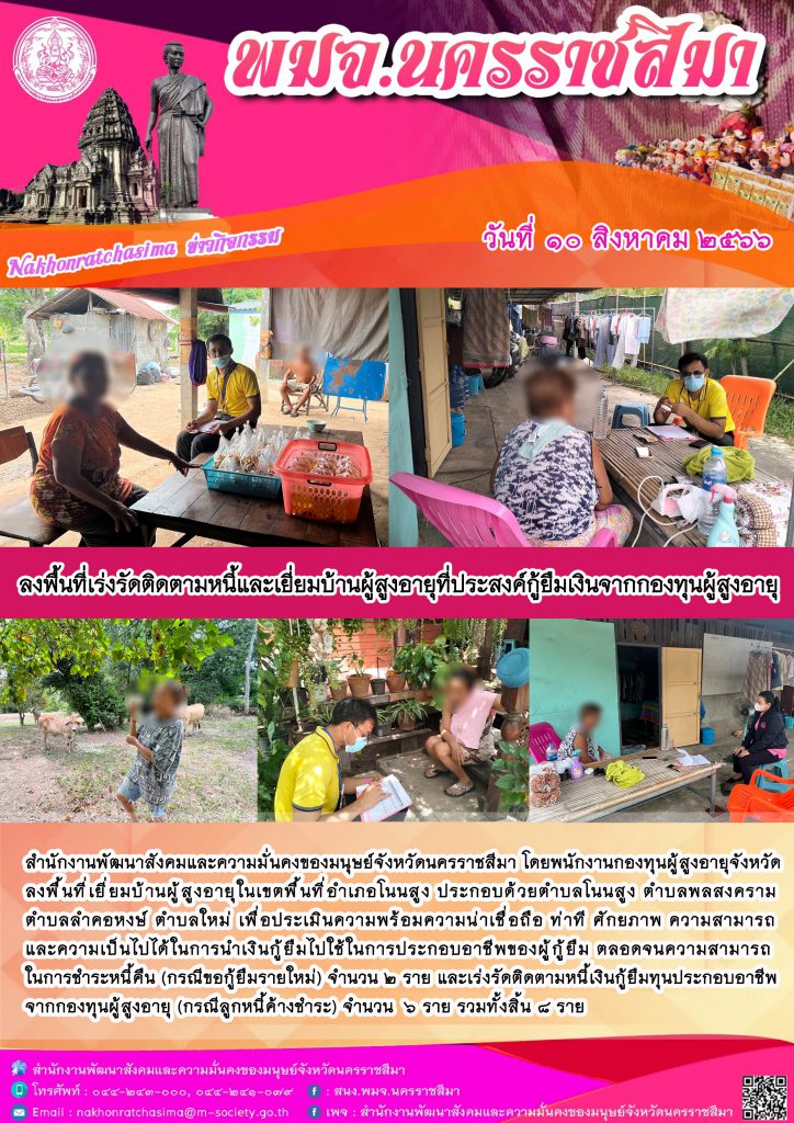 พม.นครราชสีมา ลงพื้นที่เยี่ยมบ้านติดตามคุณภาพชีวิตของผู้สูงอายุที่กู้ยืมเงินทุนประกอบอาชีพจากกองทุนผู้สูงอายุ จำนวน 8 ราย