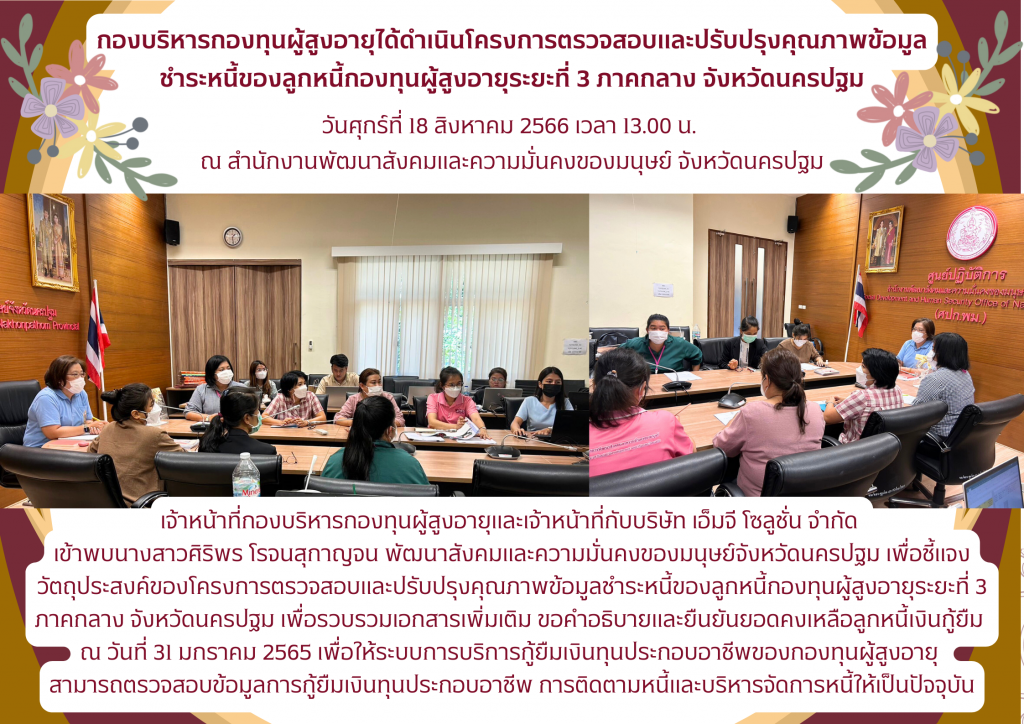 กองบริหารกองทุนผู้สูงอายุได้ดำเนินโครงการตรวจสอบและปรับปรุงคุณภาพข้อมูลชำระหนี้ของลูกหนี้กองทุนผู้สูงอายุระยะที่ 3 ภาคกลาง จังหวัดนครปฐม