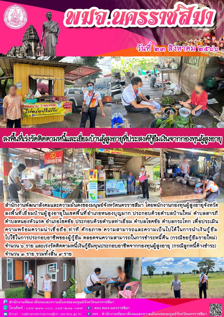 พม.นครราชสีมา ลงพื้นที่ติดตามคุณภาพชีวิตของผู้สูงอายุที่กู้ยืมเงินทุนประกอบอาชีพจากกองทุนผู้สูงอายุ จำนวน 9 ราย