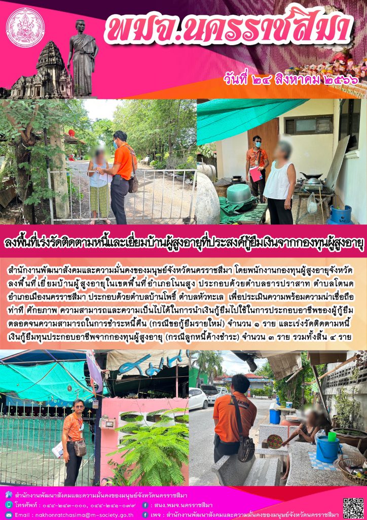 พม.นครราชสีมา ลงพื้นที่ติดตามคุณภาพชีวิตของผู้สูงอายุที่กู้ยืมเงินทุนประกอบอาชีพจากกองทุนผู้สูงอายุ จำนวน 4 ราย