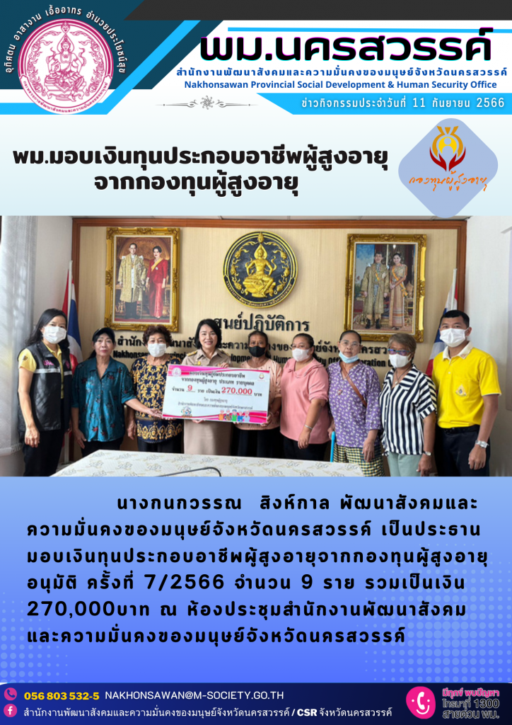 พม.นครสวรรค์ มอบเงินกู้ยืมเงินทุนประกอบอาชีพจากกองทุนผู้สูงอายุ จำนวน 9 ราย