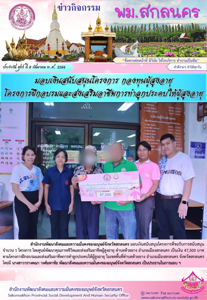 พม.สกลนคร มอบเงินสนับสนุนโครงการฝึกอบรมและส่งเสริมอาชีพการทำลูกประคบให้ผู้สูงอายุ ที่ได้รับการสนับสนุนจากกองทุนผู้สูงอายุ