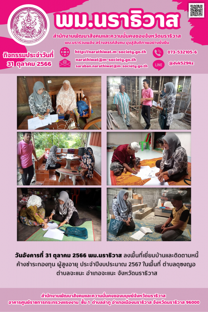 พม.นราธิวาส ลงพื้นที่ติดตามทวงถามหนี้เงินกู้ยืมกองทุนผู้สูงอายุ