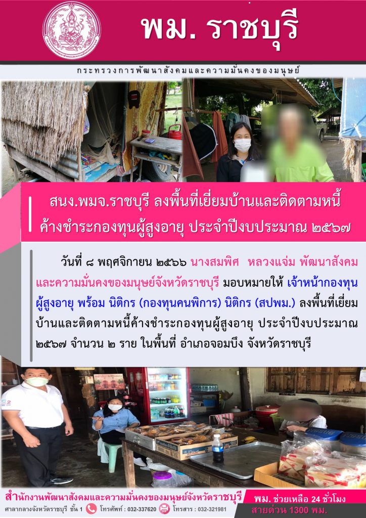 พม.ราชบุรี ลงพื้นที่เยี่ยมบ้านและติดตามทวงถามหนี้ค้างชำระกองทุนผู้สูงอายุ จำนวน 2 ราย