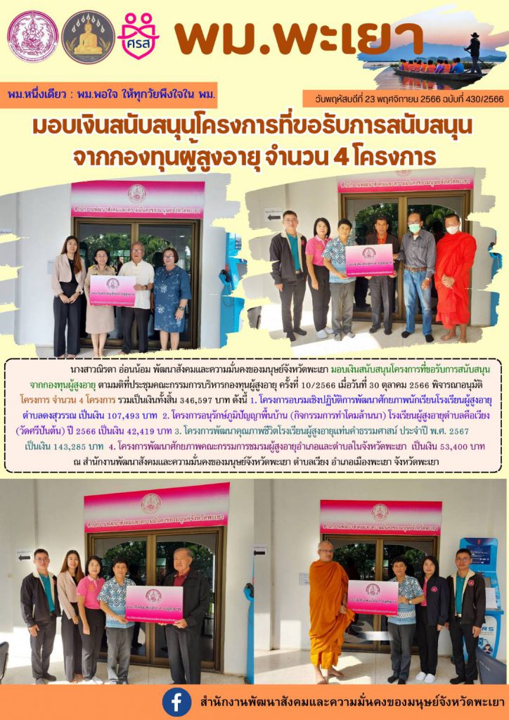 พม.พะเยา มอบเงินสนับสนุนโครงการที่ขอรับการสนับสนุนจากกองทุนผู้สูงอายุ จำนวน 4 โครงการ