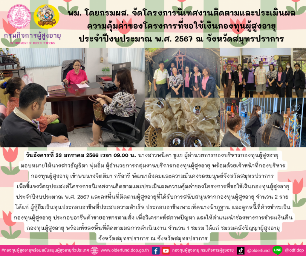 พม. โดยกรมผส. จัดโครงการนิเทศงานติดตามและประเมินผลความคุ้มค่าของโครงการที่ขอใช้เงินกองทุนผู้สูงอายุ ประจำปีงบประมาณ พ.ศ. 2567 ณ จังหวัดสมุทรปราการ