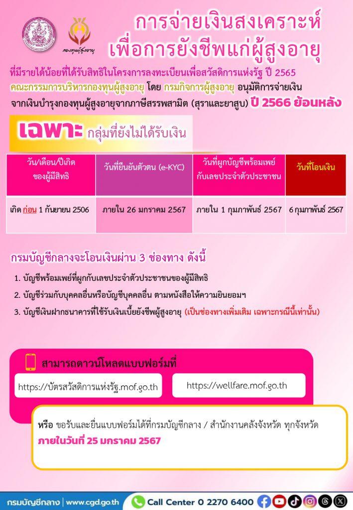 คณะกรรมการบริหารกองทุนผู้สูงอายุ โดยกรมกิจการผู้สูงอายุ อนุมัติแนวทางการจ่ายเงินสงเคราะห์เพื่อการยังชีพแก่ผู้สูงอายุที่มีรายได้น้อยฯ ย้อนหลัง ปีงบประมาณ พ.ศ. 2566 และเพิ่มช่องทางการจ่ายเงิน