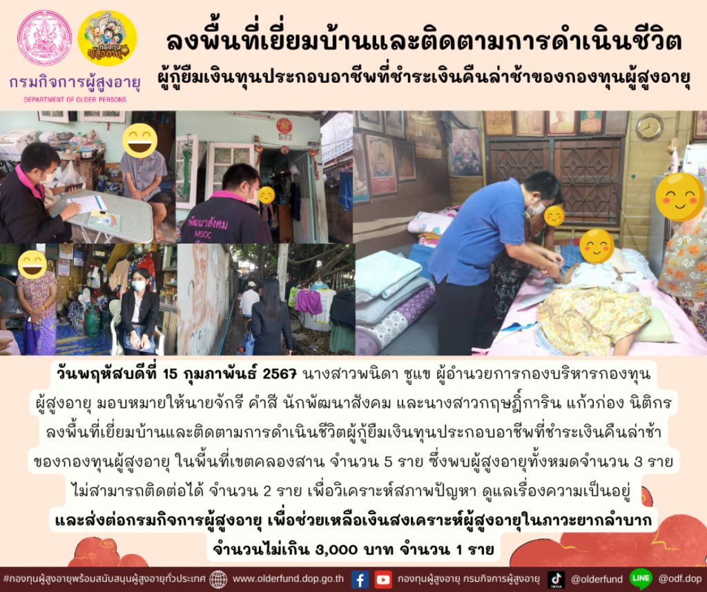 กองทุนผู้สูงอายุ (กทม.) ลงพื้นที่เยี่ยมบ้านและติดตามการดำเนินชีวิต ผู้กู้ยืมเงินทุนประกอบอาชีพที่ชำระเงินคืนล่าช้าของกองทุนผู้สูงอายุ จำนวน 5 ราย