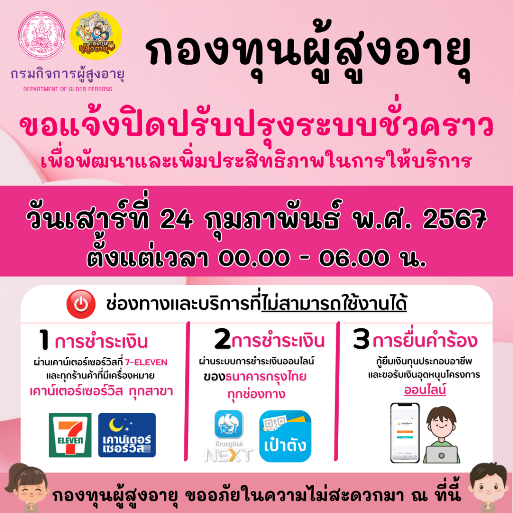 กองทุนผู้สูงอายุ ขอแจ้งปิดปรับปรุงระบบชั่วคราว เพื่อพัฒนาและเพิ่มประสิทธิภาพการบริการให้ดียิ่งขึ้น วันเสาร์ที่ 24 กุมภาพันธ์ 2567 เวลา 00.00 – 06.00 น. โดยกำหนดปิดระบบชั่วคราวในช่วงเวลาที่มีการใช้ระบบน้อยที่สุด และคำนึงถึงผลกระทบต่อผู้ใช้บริการเป็นสำคัญ กองทุนผู้สูงอายุขออภัยในความไม่สะดวกมา ณ โอกาสนี้