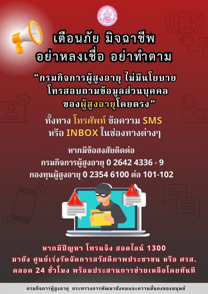 เตือนภัย มิจฉาชีพ อย่าหลงเชื่อ อย่าทำตาม !! กองทุนผู้สูงอายุ กรมกิจการผู้สูงอายุ ไม่มีนโยบายโทรสอบถามข้อมูลส่วนบุคคลของผู้สูงอายุ ทั้งทางโทรศัพท์ ข้อความ SMS หรือ INBOX ในช่องทางต่างๆ