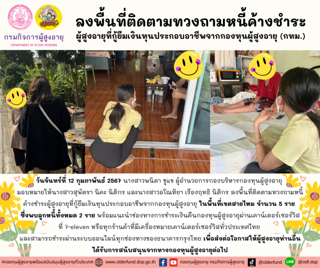 กองทุนผู้สูงอายุ (กทม.) ลงพื้นที่ติดตามทวงถามหนี้ค้างชำระผู้สูงอายุที่กู้ยืมเงินทุนประกอบอาชีพจากกองทุนผู้สูงอายุ จำนวน 5 ราย พร้อมทั้งแนะนำช่องทางการชำระเงินคืนกองทุนผู้สูงอายุ