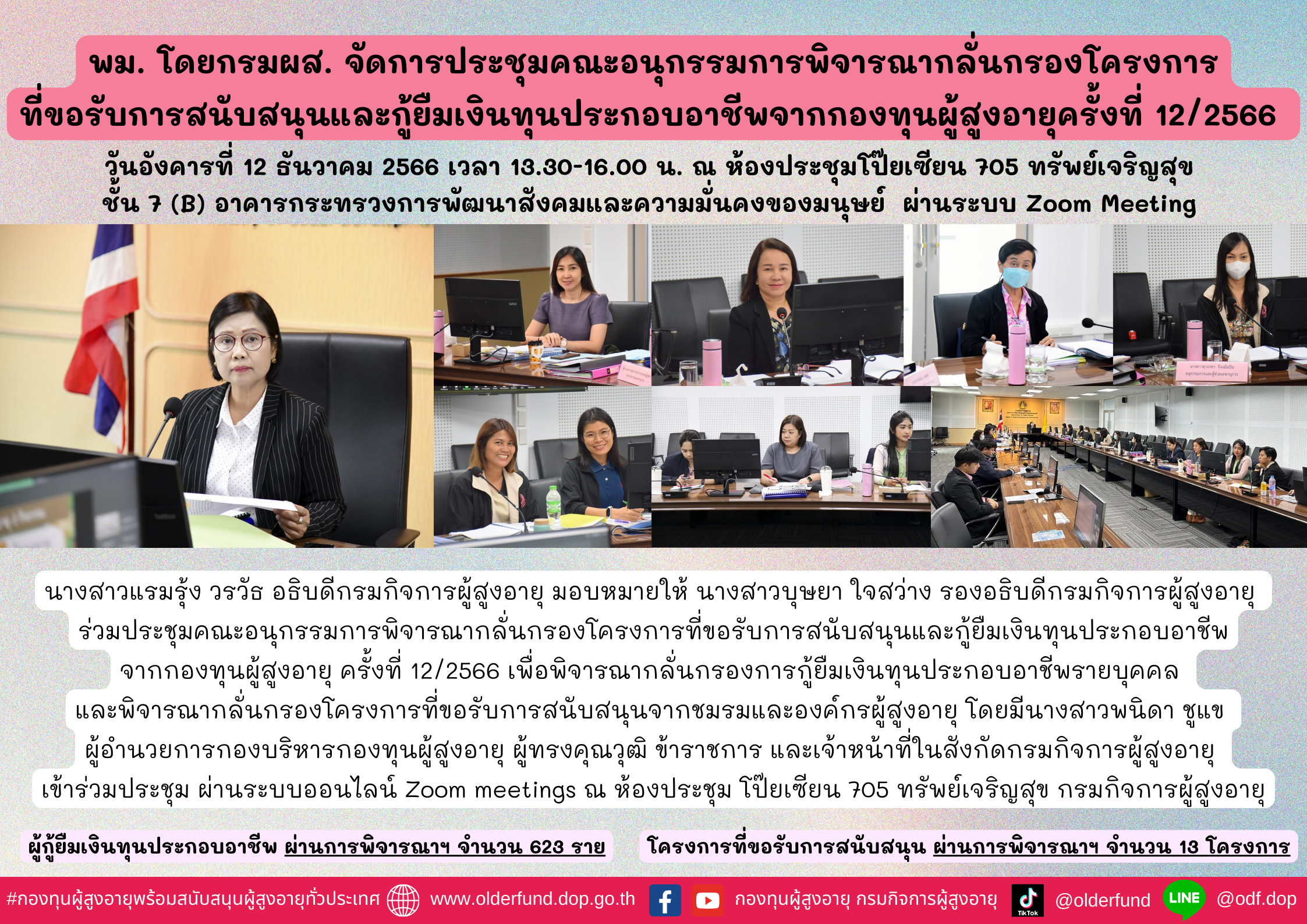 พม. โดยกรมผส. จัดการประชุมคณะอนุกรรมการพิจารณากลั่นกรองโครงการ ที่ขอรับการสนับสนุนและกู้ยืมเงินทุนประกอบอาชีพจากกองทุนผู้สูงอายุครั้งที่ 12/2566