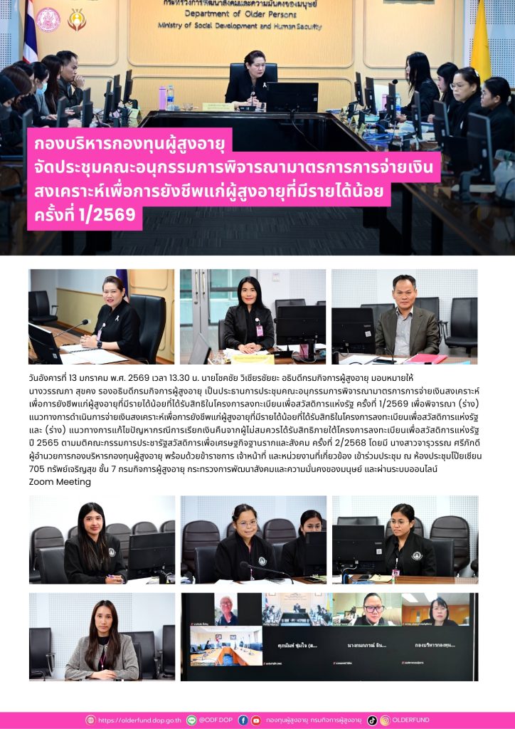 พม. โดยกรมผส. ประชุมคณะอนุกรรมการพิจารณากลั่นกรองโครงการที่ขอรับการสนับสนุนโครงการที่ขอรับการสนับสนุนและกู้ยืมเงินทุนประกอบอาชีพจากกองทุนผู้สูงอายุ ครั้งที่ 1/2569